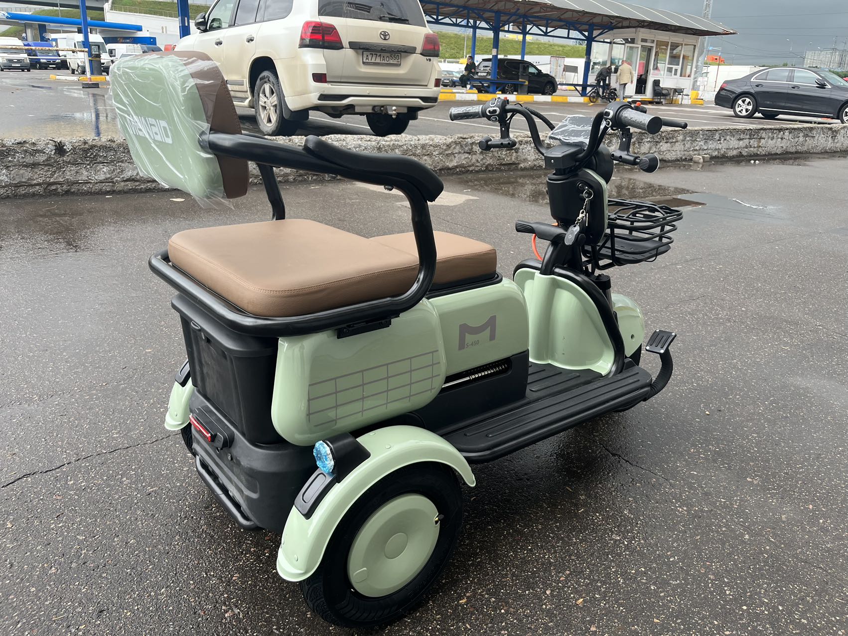 Аккумулятор литиевый 60V/20A. Мотор 800 W Заряд 8 часов Пробег до 60 км. Функция: Пульт. Сигнализация. Барабанный тормоз перед/зад. Рама: Железная Вес: 175кг. Мощность: 800W по документам 240W Максимальная скорость: до 50км/ч Максимальная нагрузка: до 300 кг. Пробег на одном заряде: до 60 км. Резина 300-8 Контроллер надёжно спрятан, не нужно беспокоиться о его влагоза 3 режима скорости Передняя фара Поворотники Сигнал Задний ход Передняя карзина Зеркала заднего вида 2 пульт дистанционного управления Права не требуются