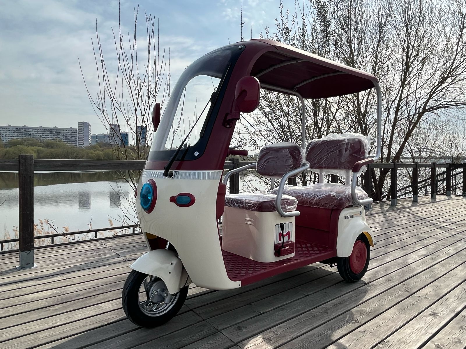 Размер: 2100X860X1700MM. Аккумулятор: 60В/20Ач. Бесшумный электрический мотор 1200W. Покрышка: Бескамерная покрышка, 300-10 стальные диски. Передняя алюминевая гидравлическая вилка, которая обеспечевает плавную и комфортную езду, прочное сцепление с землей и минима скольжения. Контроллер: Беспроводной двенадцати ламповый контроллер. Противоугонная система: Сигнализация с двумя пультами управления. Тормозная система: Передние 110 и задние 130 большие, керамические, барабанные тормоза. Встроенный интелектуальный противоскользящий тормоз. Дисплей: Сверхбольшой цифровой экран, однострочный коммуникационный прибор. Переднее лобовое стекло. Цельная крыша. Встроенные левые и правые подставки для удобного хранения вещей. Мощная LED фара. Рама покаршена методом горячей сушки: кислотная очистка
